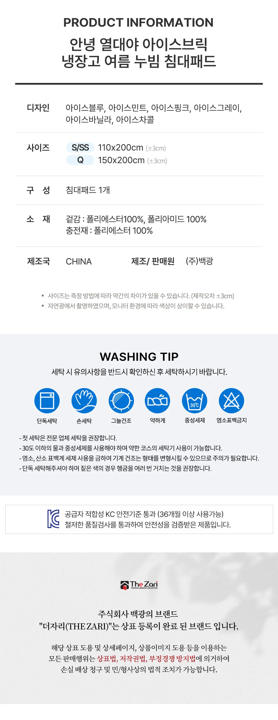 ★여름시즌오프특가★ [아이스브릭] thezari 더자리 냉감 시원한 여름쿨링 누빔 침대패드 SS/Q (6color)