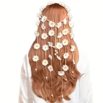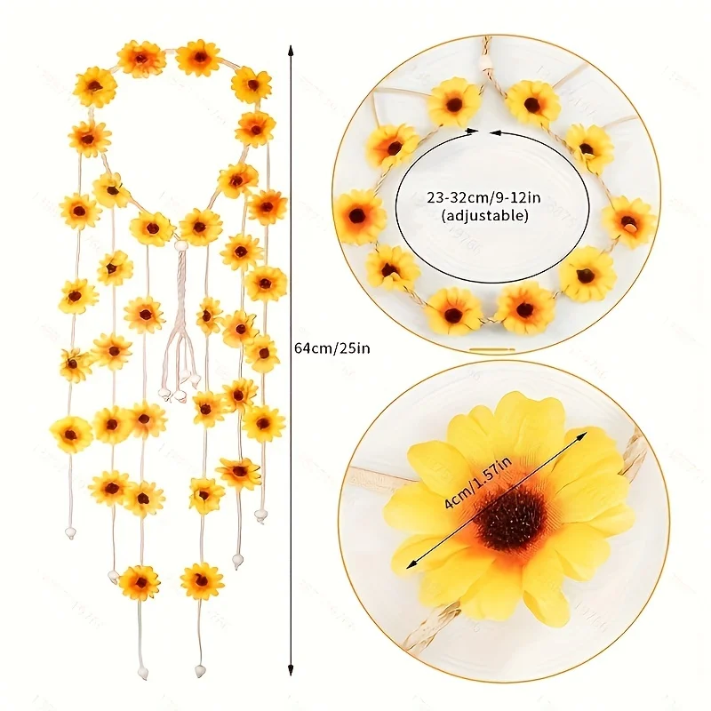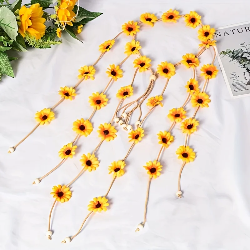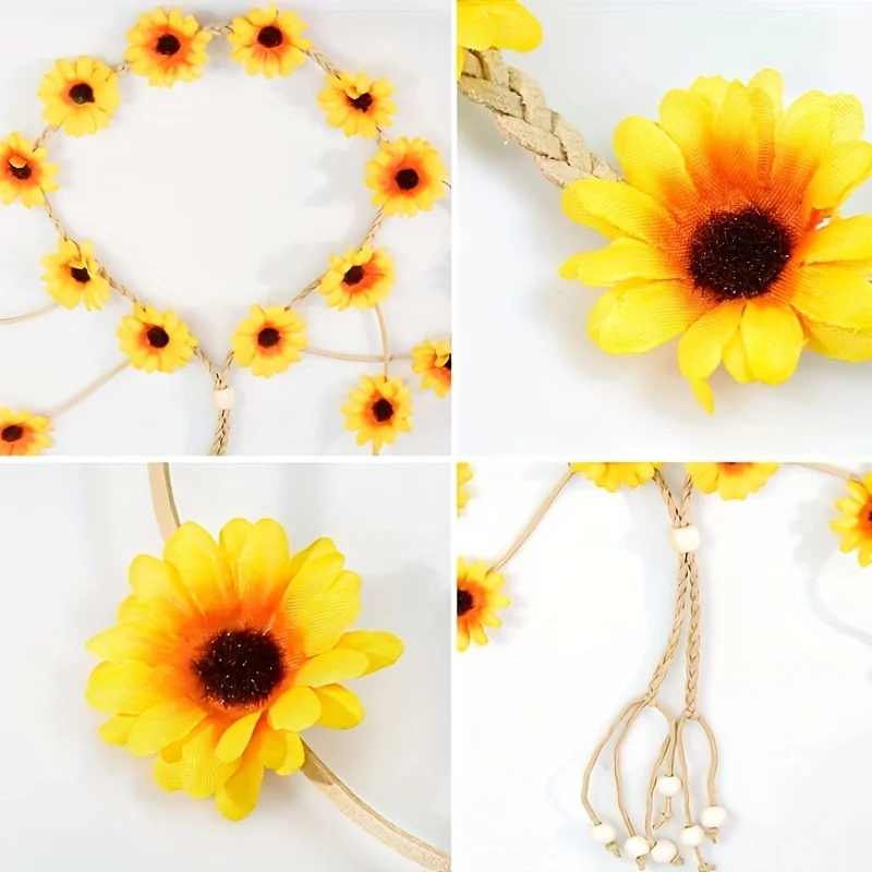 꽃 히피 머리띠, 꽃 왕관, 70년대 보헤미안 의류 스타일에 어울리는 여름 해바라기 헤어 액세서리