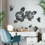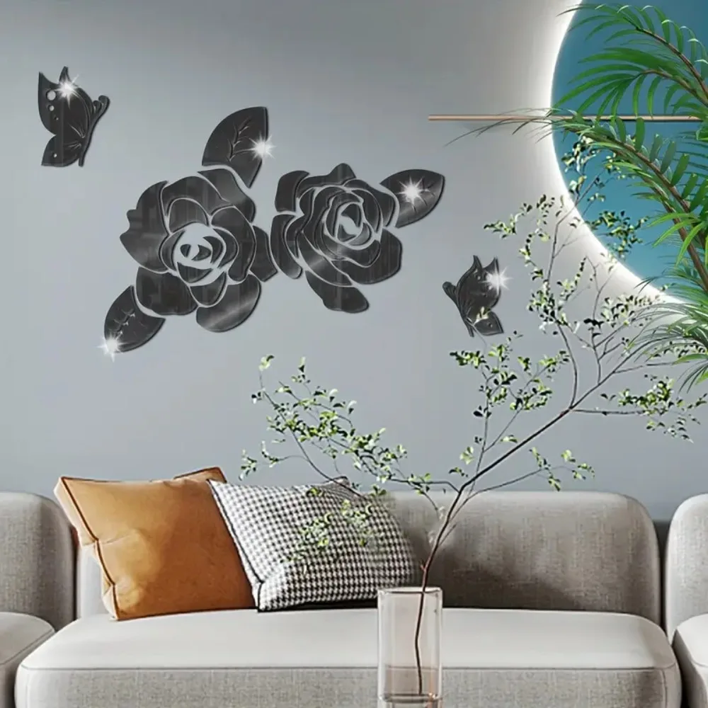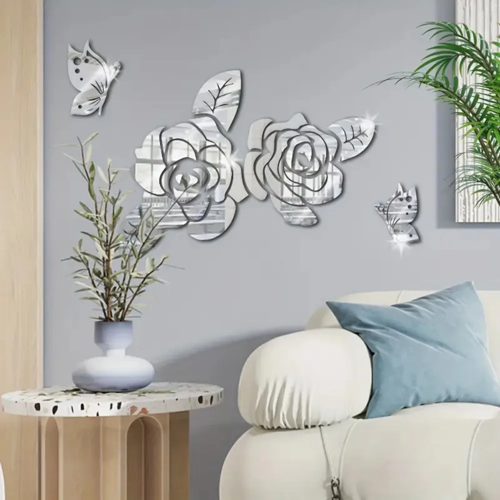 나비 3D 로즈 미러 벽 스티커 자체 접착 아크릴 거울 사랑스러운 꽃 데칼 DIY 장식 이동식 장식 벽화