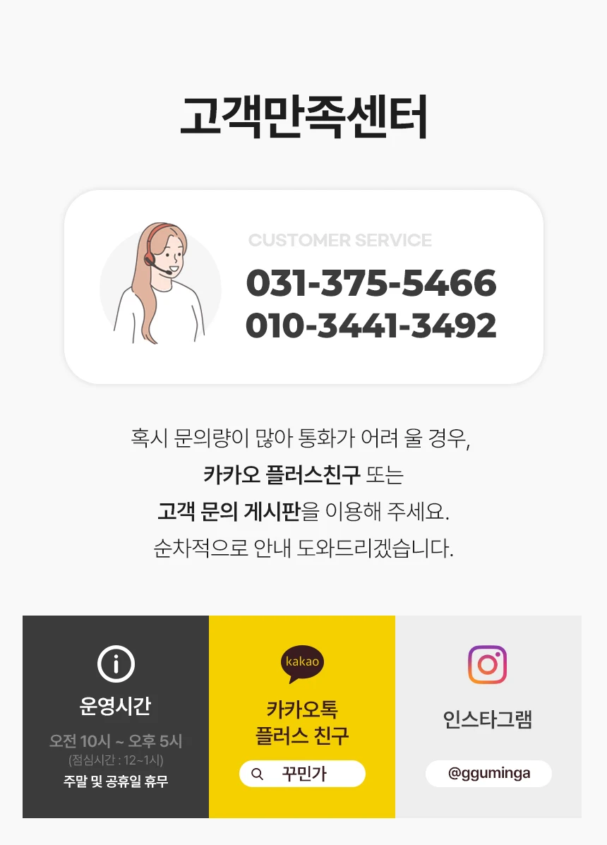 3.상품 문의는 페이지오른쪽 아래 모서리의 고객센터 창을 통해우선 (우선) 접수해 주시기 바랍니다. 문의 시 주문 번호를 함께 제공해 주시면 신속히 답변 드리겠습니다.