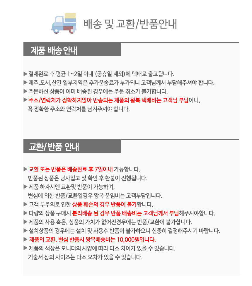 1.이유없는 반품 시 상품이 이미 발송된 경우 반송 비용(반송료 및 배송료)를 부담해야 합니다.