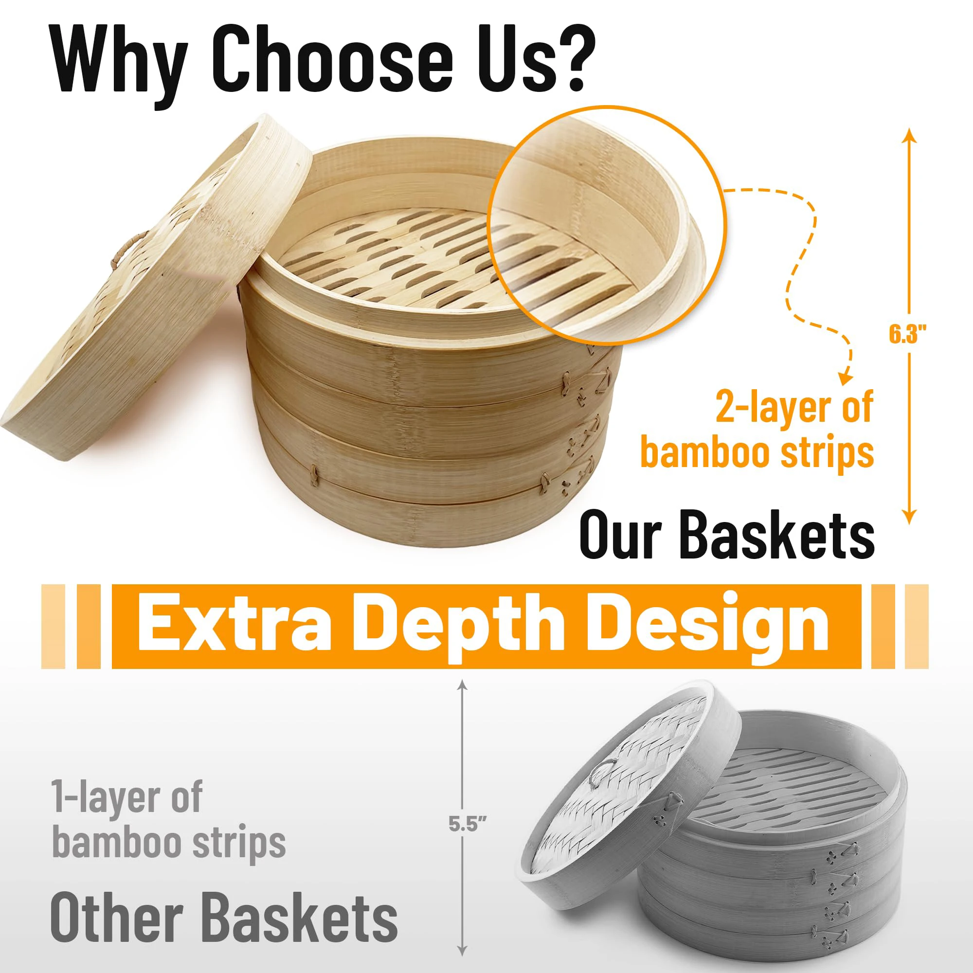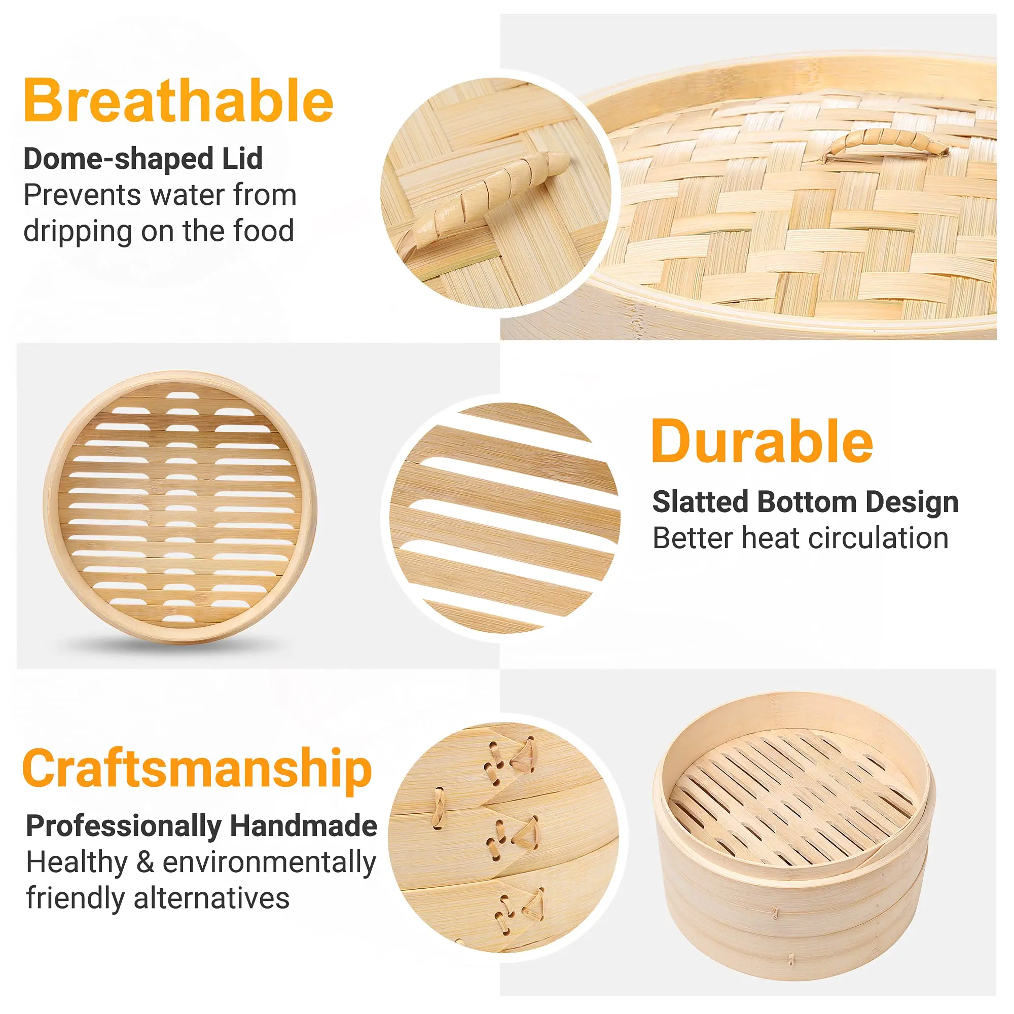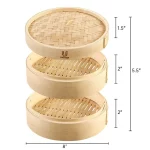 • 2: Large 3 tier steamer with handmade bamboo lid with stackable layers and slatted bases. 3-tier baskets can cook or reheat more portions at the same time.