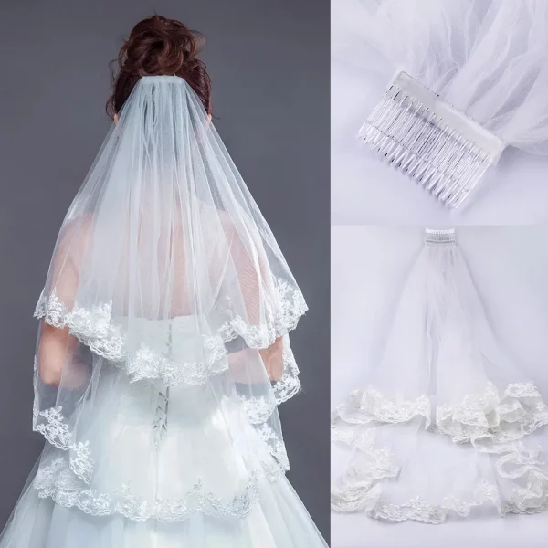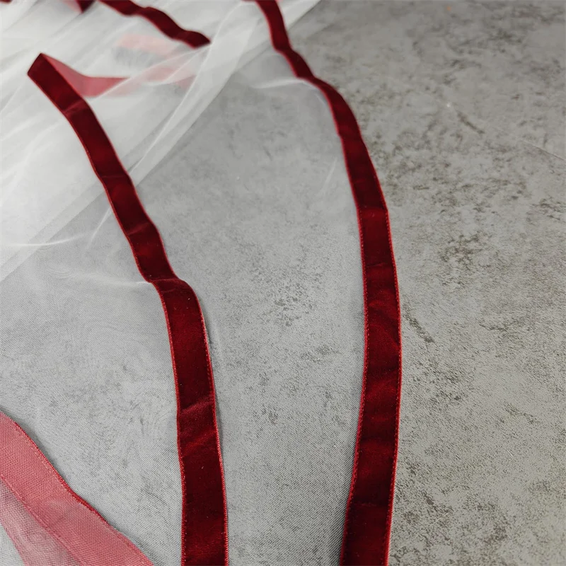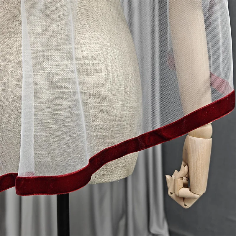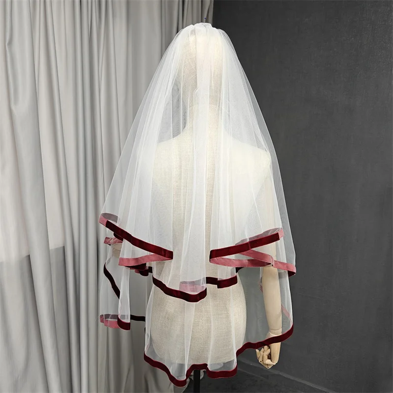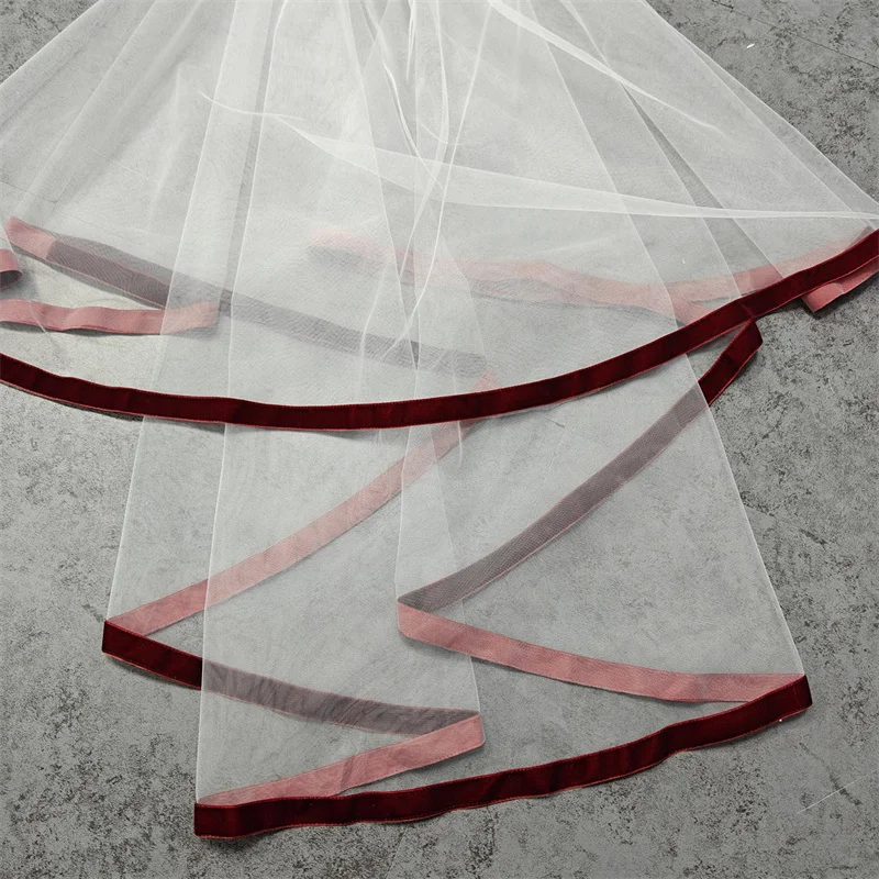 맞춤형 부르고뉴 리본 가장자리 화이트/아이보리 Tulle 짧은 웨딩 베일 블러셔 2단 짧은 신부 베일 빗 포함