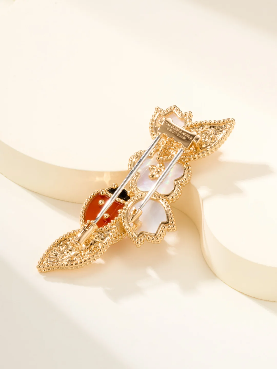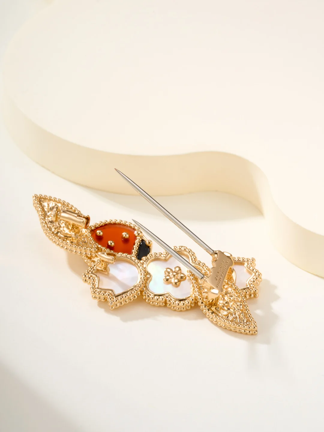 무당벌레와 꽃 모티브가 있는 브로치는 완벽한 장인정신으로 백금으로 전기 도금되었습니다.