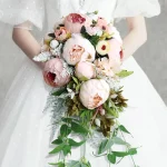 웨딩 부케는 아름다운 모란 꽃과 잎으로 장식되어 더욱 독특하고 아름답습니다.