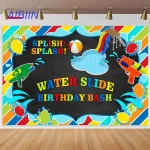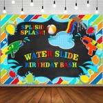 소년 워터 슬라이드 배쉬 배경 스플래시 칠판, 여름 수영장 공, 물총 파티 장식 배경