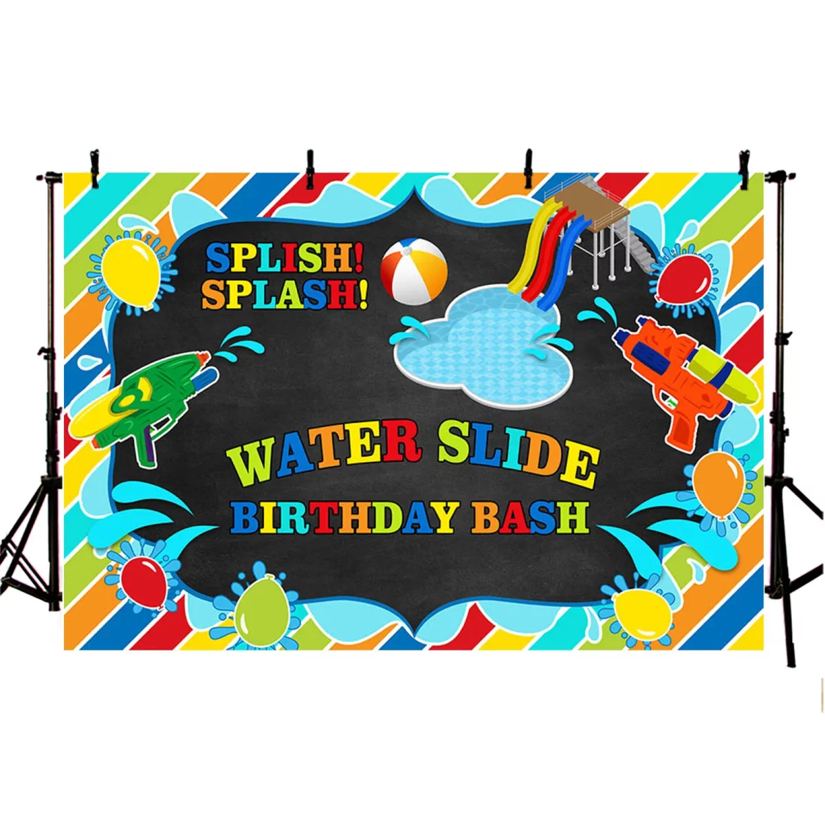 소년 워터 슬라이드 배쉬 배경 스플래시 칠판, 여름 수영장 공, 물총 파티 장식 배경