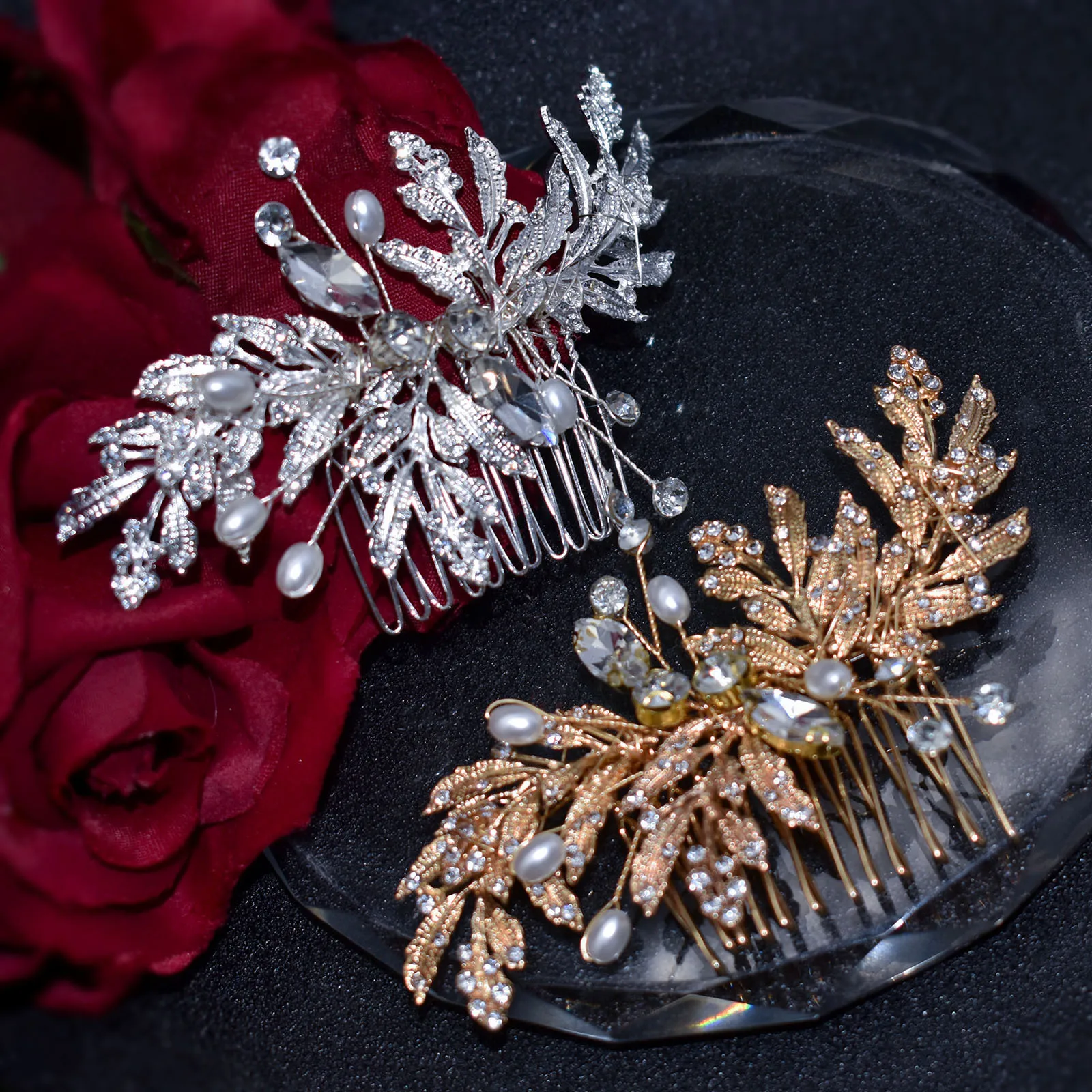 수제 골드 실버 컬러 웨딩 헤어 액세서리 크리스탈 여성 헤어 빗 잎 신부 머리띠 머리 보석