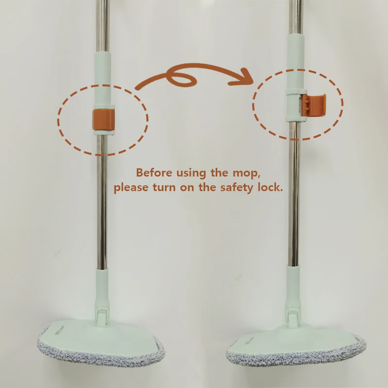걸레를 사용하기 전에 안전 잠금 장치를 켜십시오. 잠금 장치가 열린 후에 만 폴이 정상적으로 연장되고 수축 될 수 있습니다. 그렇지 않으면 걸레를 회전시킬 수 없습니다. 사용 중에 문제가 있으면 고객 서비스에 문의하십시오.