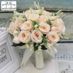 실크 새틴 리본이 달린 인공 천연 장미 웨딩 부케, 핑크 화이트 샴페인 신부 들러리 파티