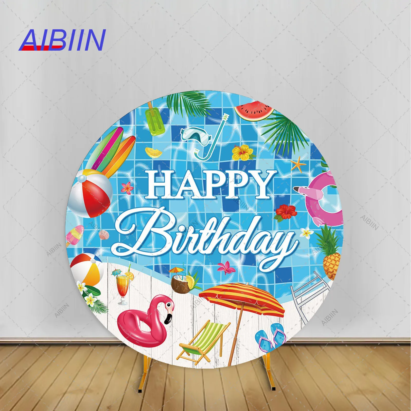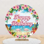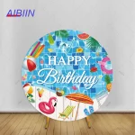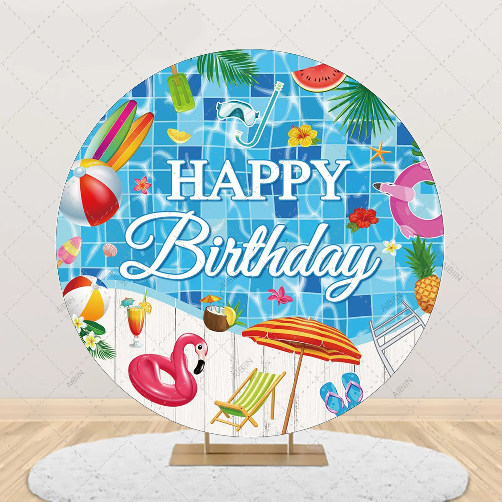 여름 수영장 파티 생일 축하 라운드 배경 커버 열대 플라밍고 수박 서핑 보드 파티 장식 사진 배경