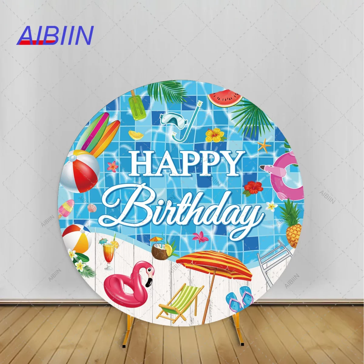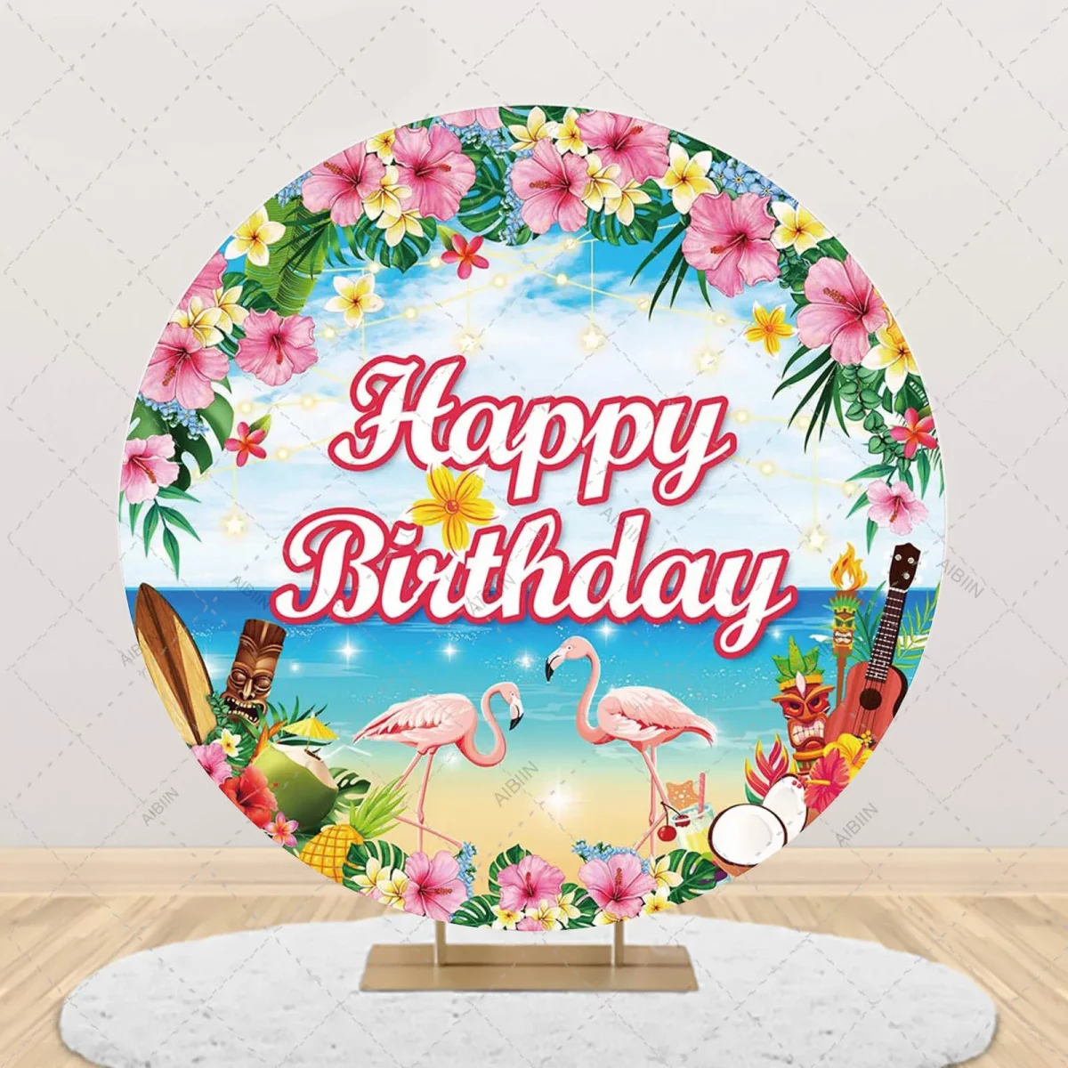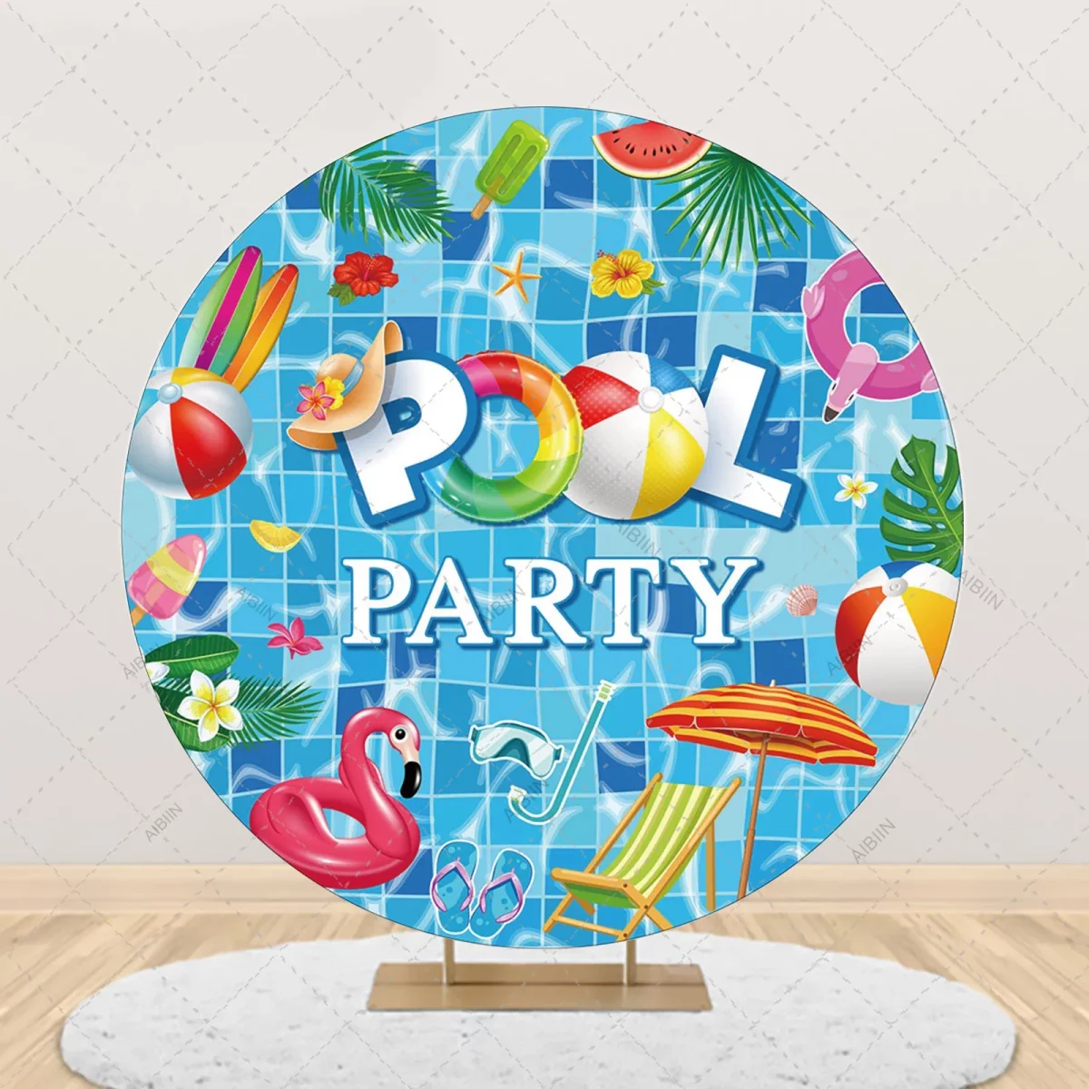 여름 수영장 파티 생일 축하 라운드 배경 커버 열대 플라밍고 수박 서핑 보드 파티 장식 사진 배경