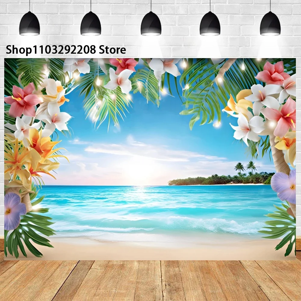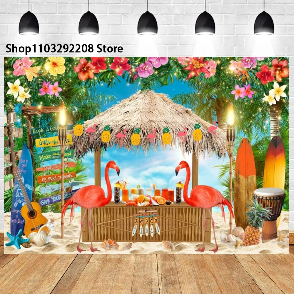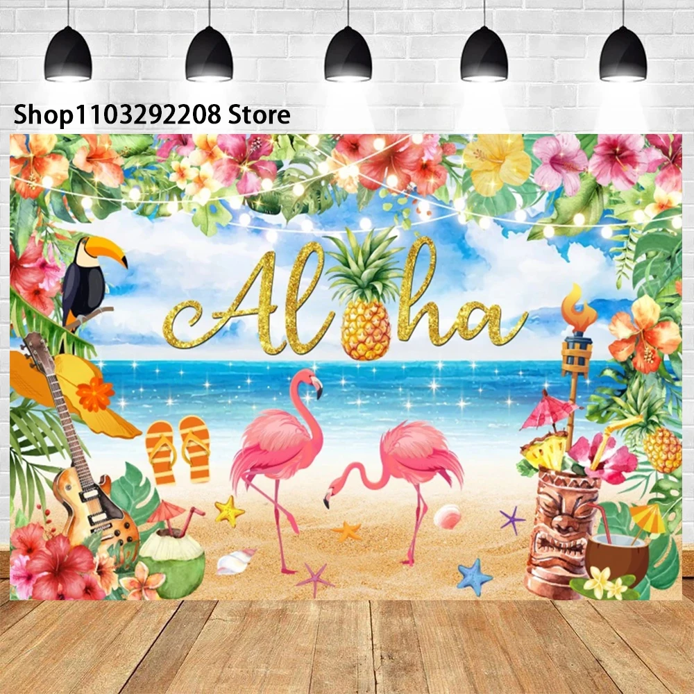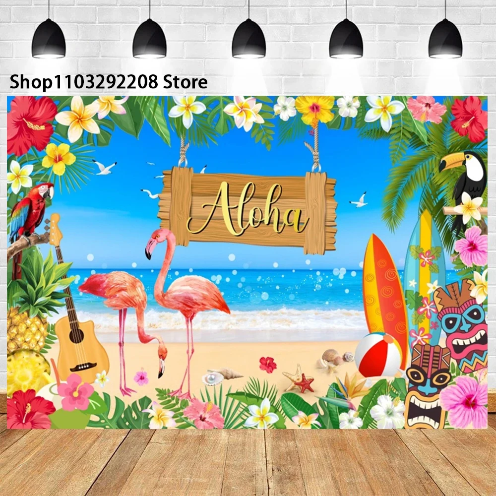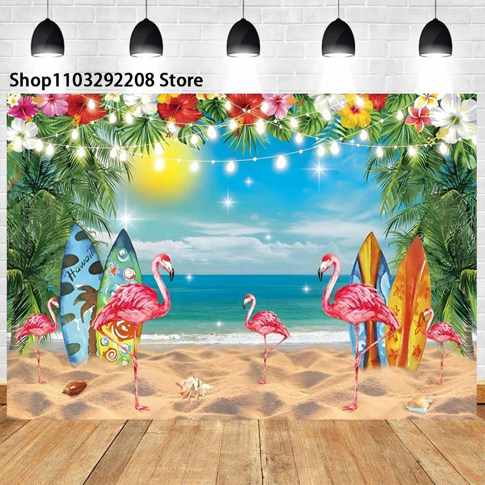 여름 하와이 해변 테마 열대 꽃 알로하 플라밍고 서핑 보드 해변 생일 아이 휴일 파티 사진 배경