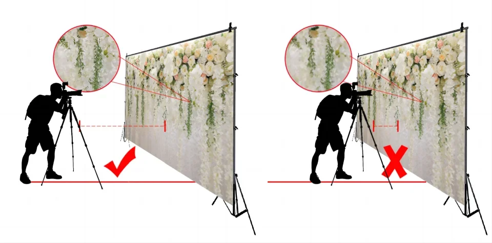 The backdrops need keep distance to take pictures. Also many large size images may seen a little pixelated. Different lighting will have different shooting effect,you can try to adjust the lights to make your photos better.