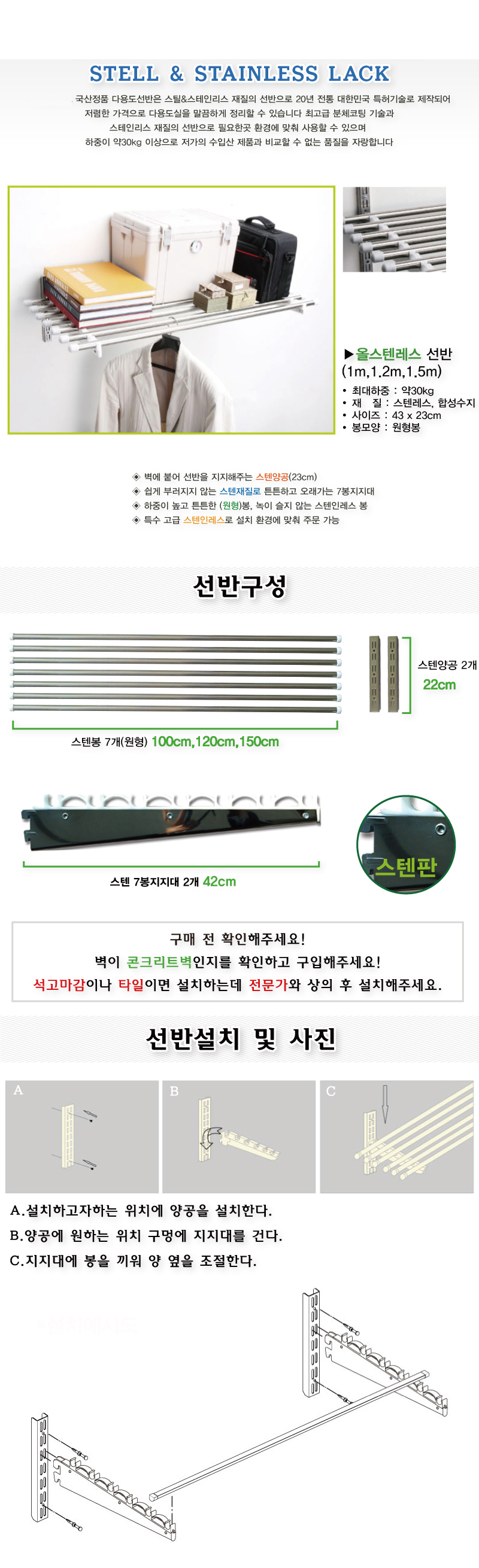 (올스텐7봉 1.2m)다용도 길이조절 스텐 DIY 인테리어 정리 수납 벽걸이 선반