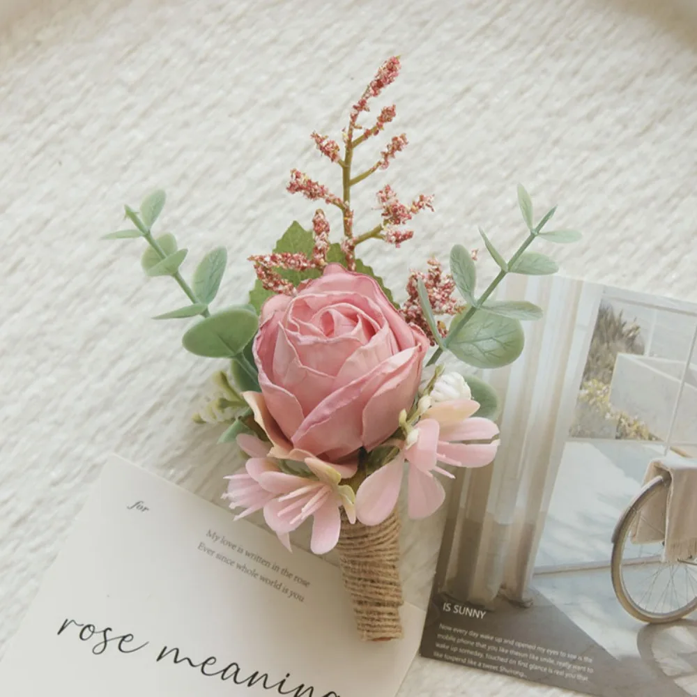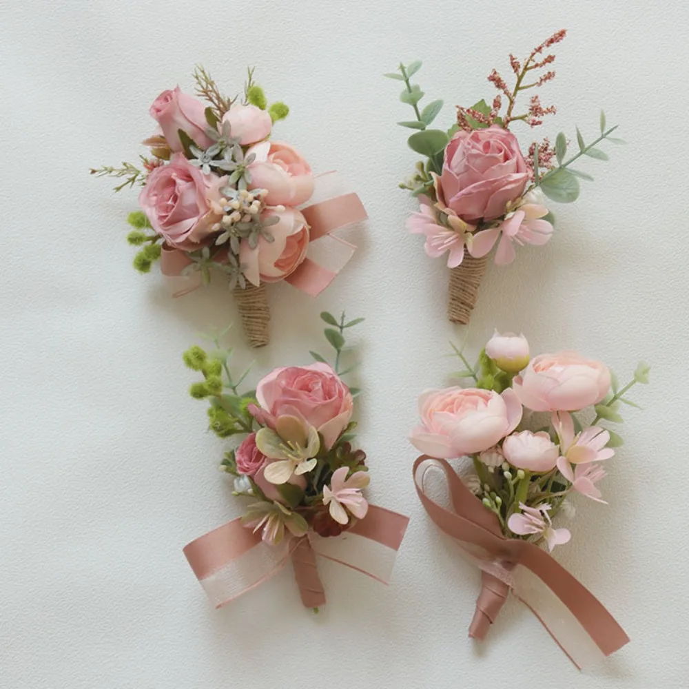 웨딩 인공 꽃 실크 로즈 Boutonniere Ribbion 손목 코사지 Botonier Para Novio Boda