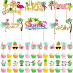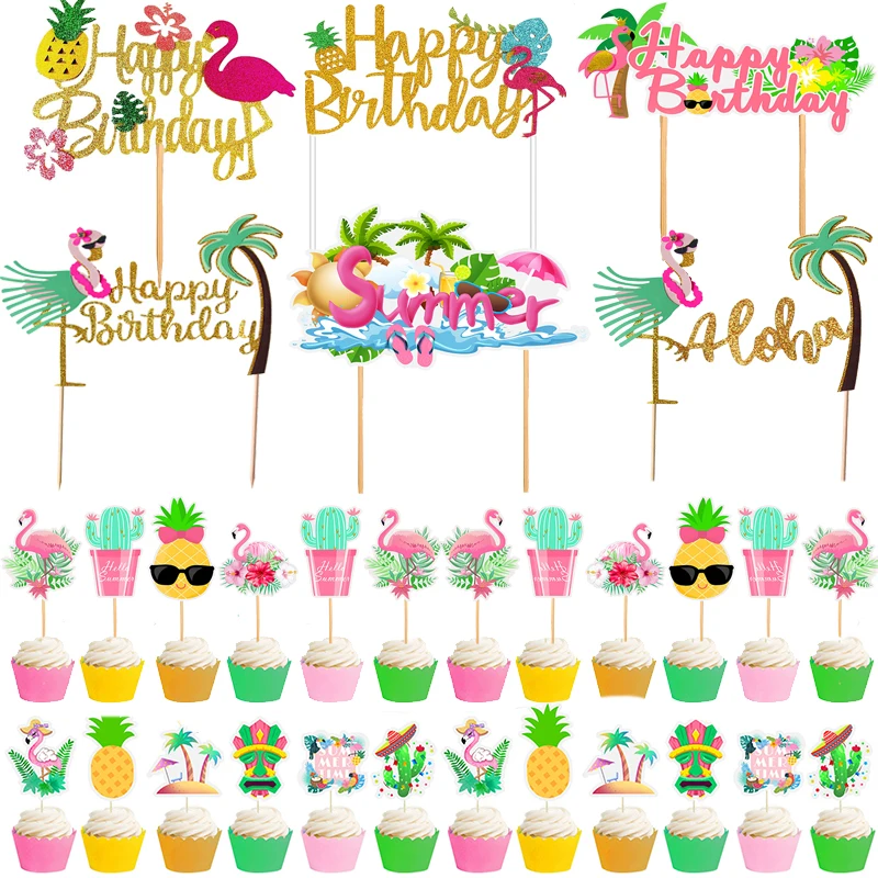 하와이 컵케익 토퍼 플라밍고 파인애플 생일 축하 케이크 토퍼 열대 여름 해변 생일 파티 케이크 장식