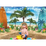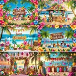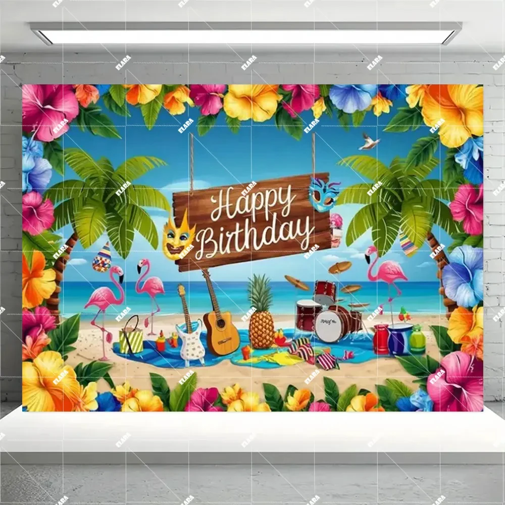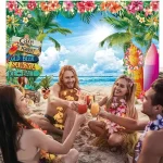 하와이 열대 해변 배경 천 - 코코넛 잎, 서핑 보드 및 꽃이 포함되어 여름 파티에 적합합니다.