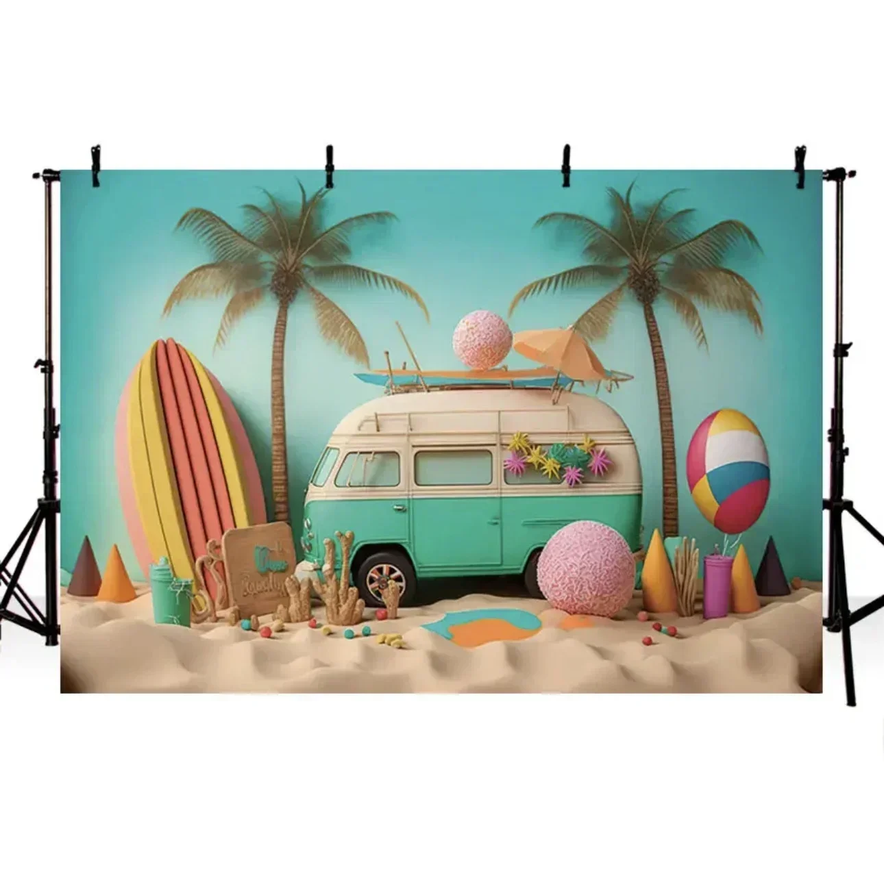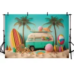 해변 디저트 트럭 여름 사진 배경 야자수 서핑 보드 쉘 블루 해변 조각 파티 사진 배경