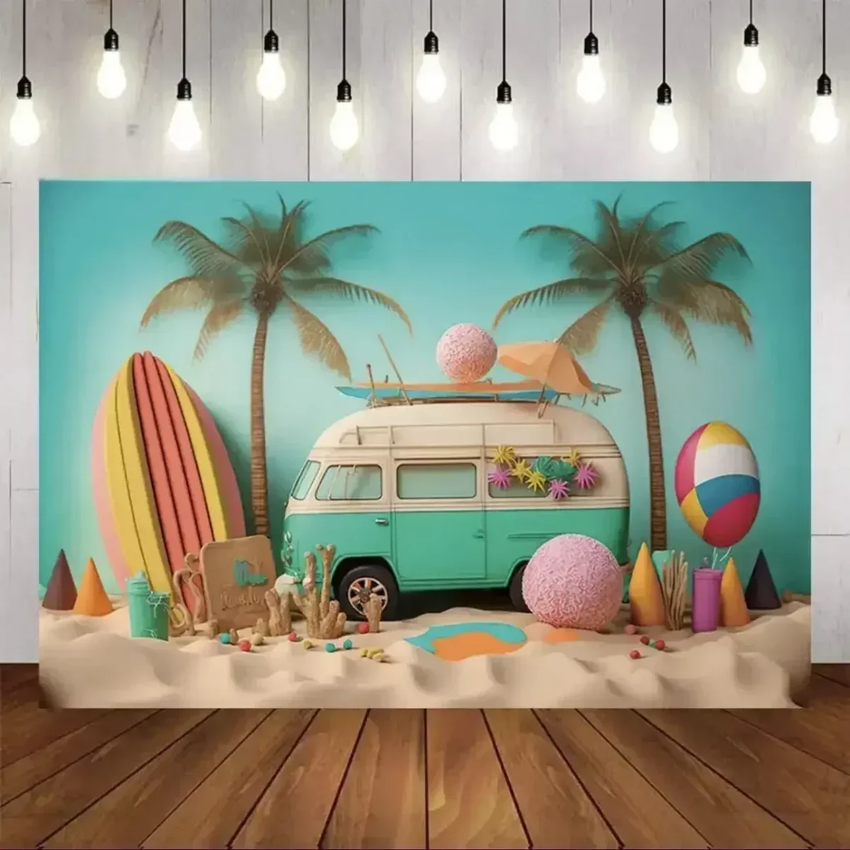 해변 디저트 트럭 여름 사진 배경 야자수 서핑 보드 쉘 블루 해변 조각 파티 사진 배경
