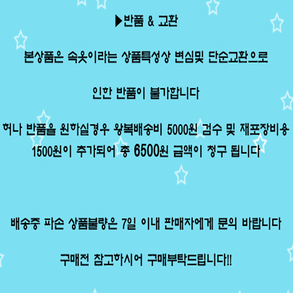1.이유없는 반품 시 상품이 이미 발송된 경우 반송 비용(반송료 및 배송료)를 부담해야 합니다.