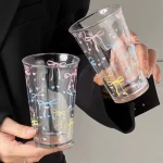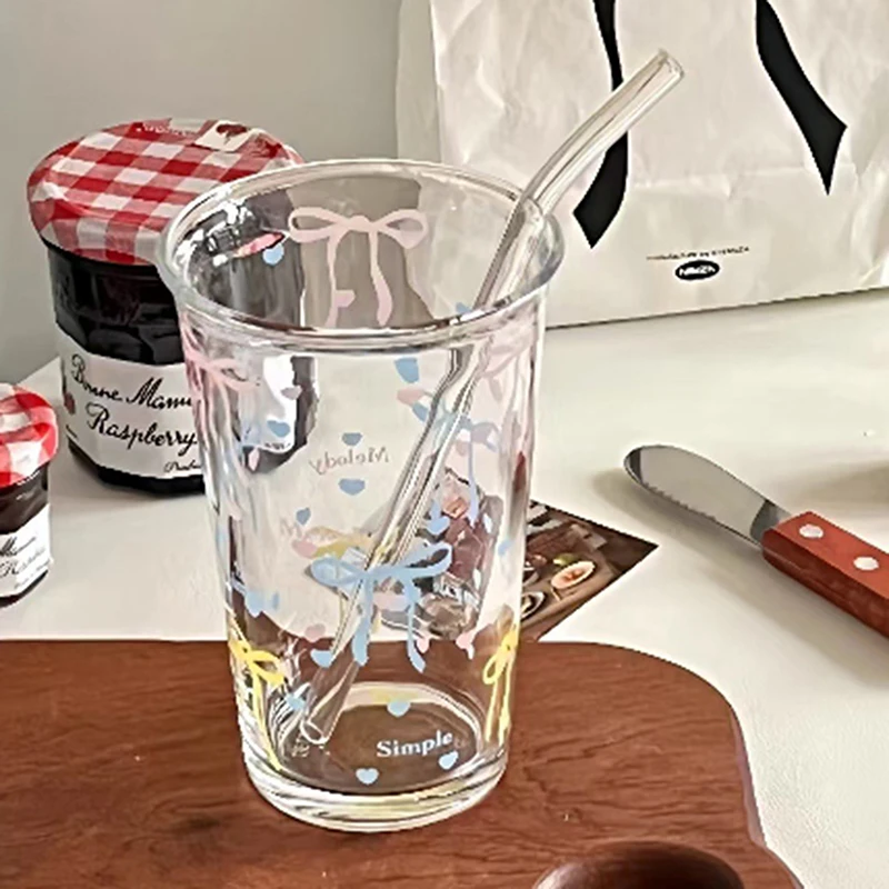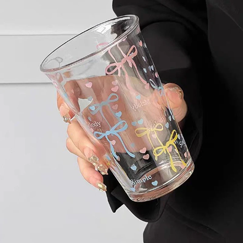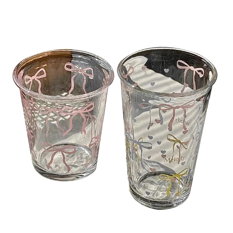 1.개인용 봄, 여름 유리컵입니다.컵 본체는 매우 귀여운 핑크색 리본, 둥근 컵 모양, 세로 줄무늬 엠보싱 디자인으로 장식되어 있습니다.