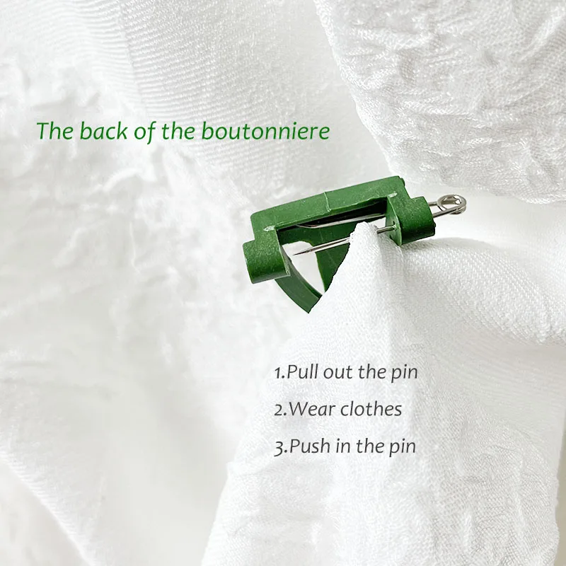 A:부토니에르 뒷면에 핀이 있습니다. 핀을 옆으로 옮기고 옷 단추에 통과시키세요.