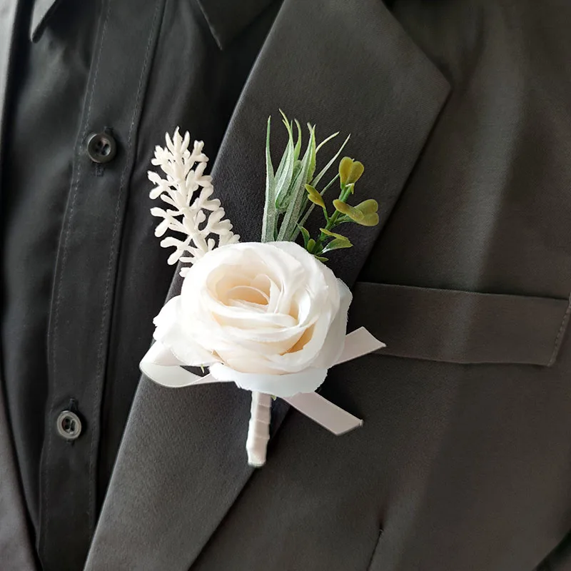 화이트 웨딩 Boutonniere 손님 신랑 손목 꽃 인공 실크 장미 코사지 단추 구멍 신부 들러리 결혼 액세서리