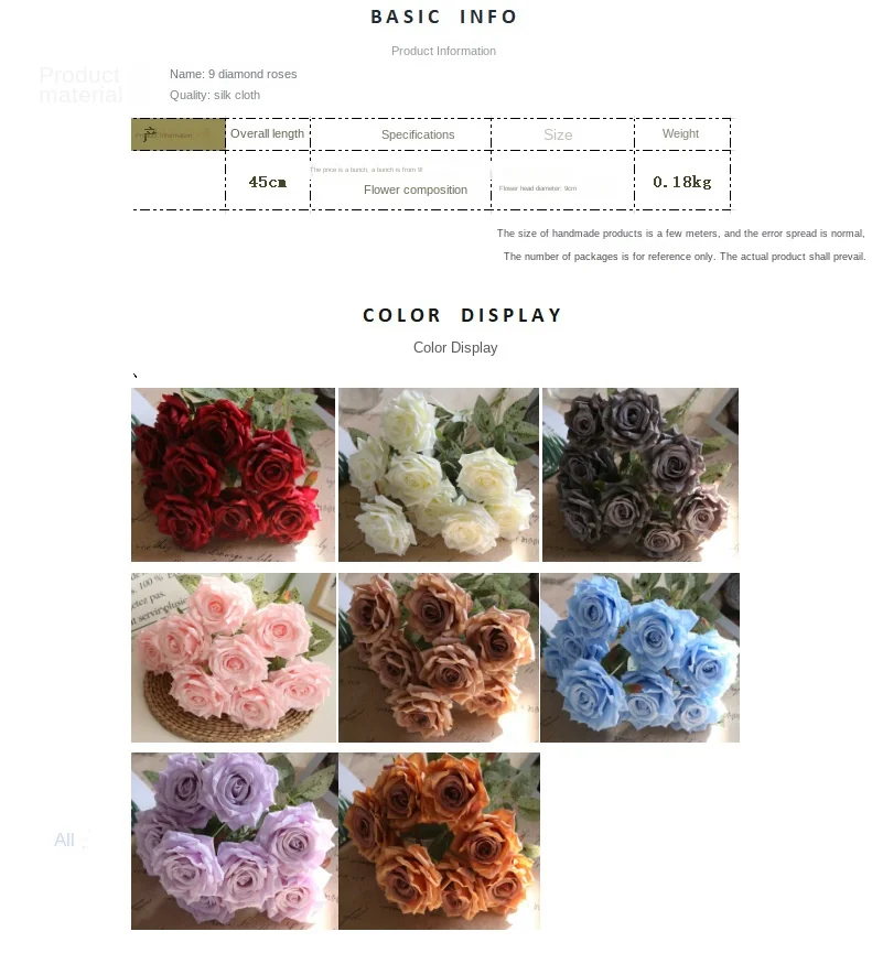 1 꽃다발 9 머리 인공 다이아몬드 장미 웨딩 테이블 화이트 로즈 꽃다발 웅크 리고 장미 인공 꽃 홈 웨딩 장식
