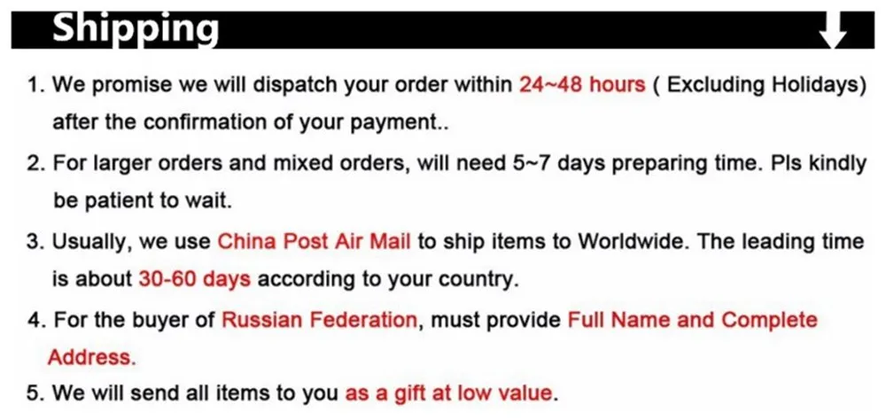 2.상품이 재고 부족 (재고 부족)되는 경우 해외 창고에서 발송하며 72시간 이내에 문자 메시지로 알려드리겠습니다. 해외 발송 상품은 예상 5-8 영업일 이내에 발송이 완료됩니다.