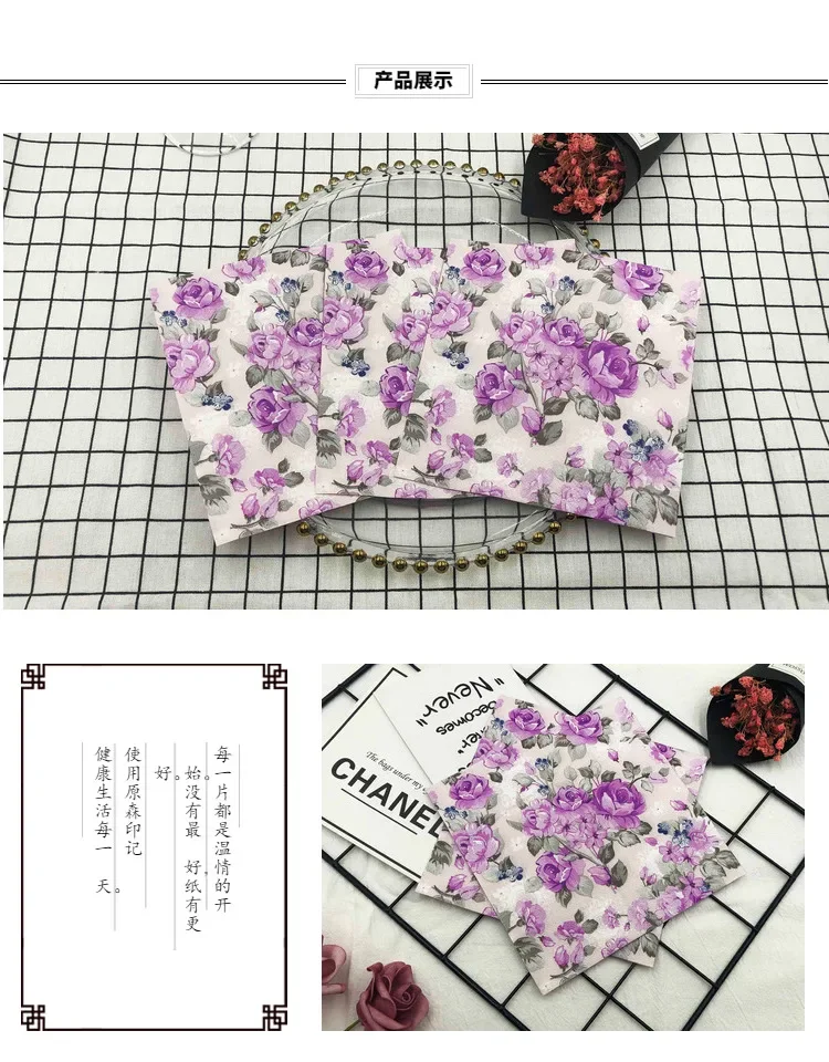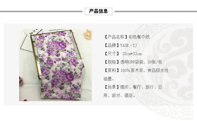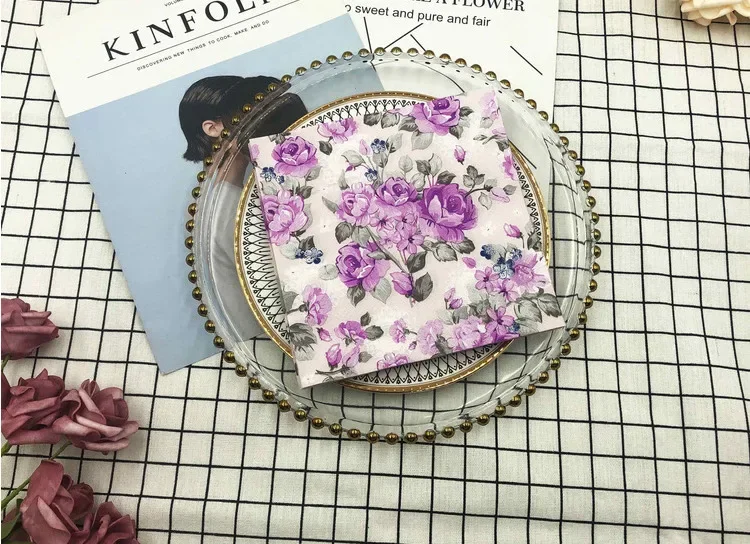 20 개/갑 다채로운 인쇄 냅킨 2 플라이 보라색 꽃 립스틱 종이 서양 레스토랑 웨딩 와인 유리 꽃 종이