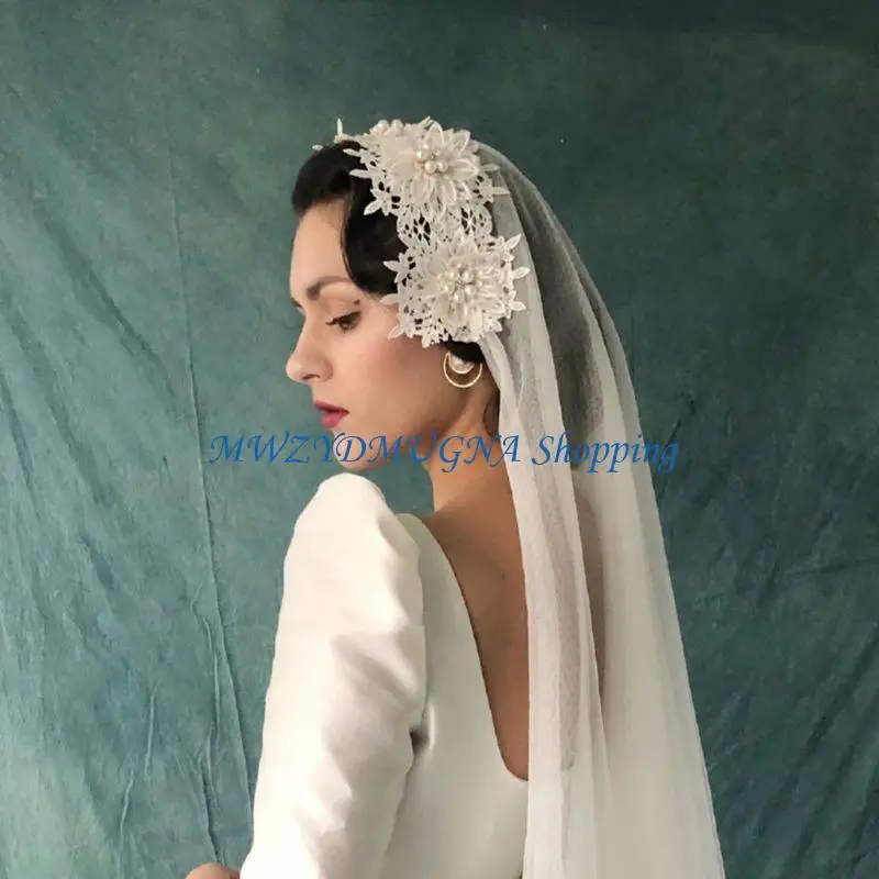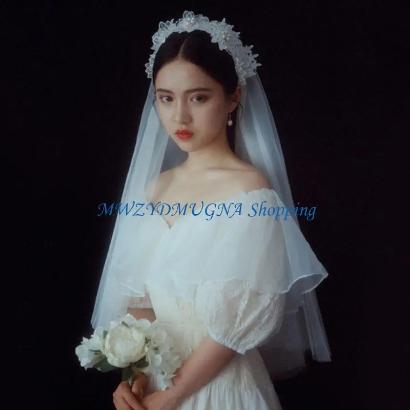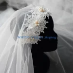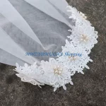 2단 더블 레이어 웨딩 베일, 라인스톤 및 모조 진주 꽃 장식을 위한 반짝이가 있는 섬세한 꽃무늬 레이스 아플리케.