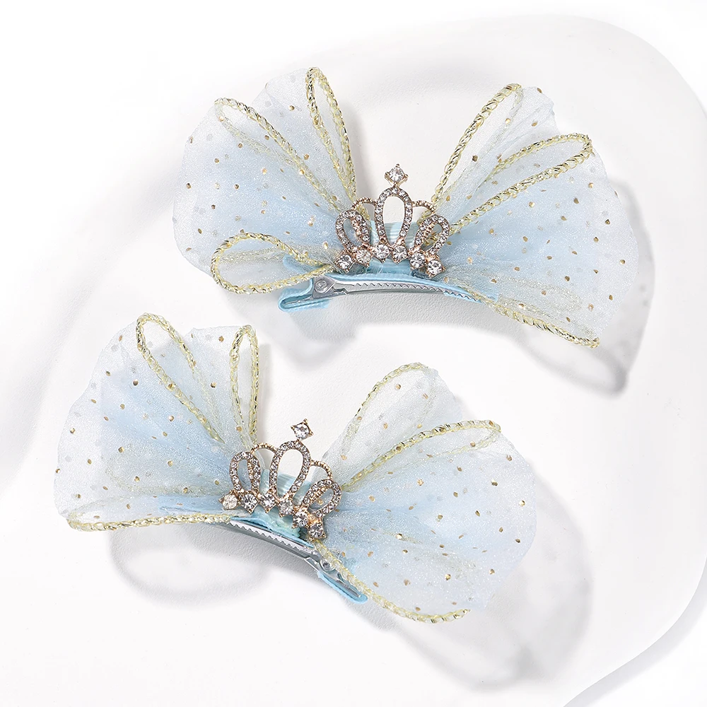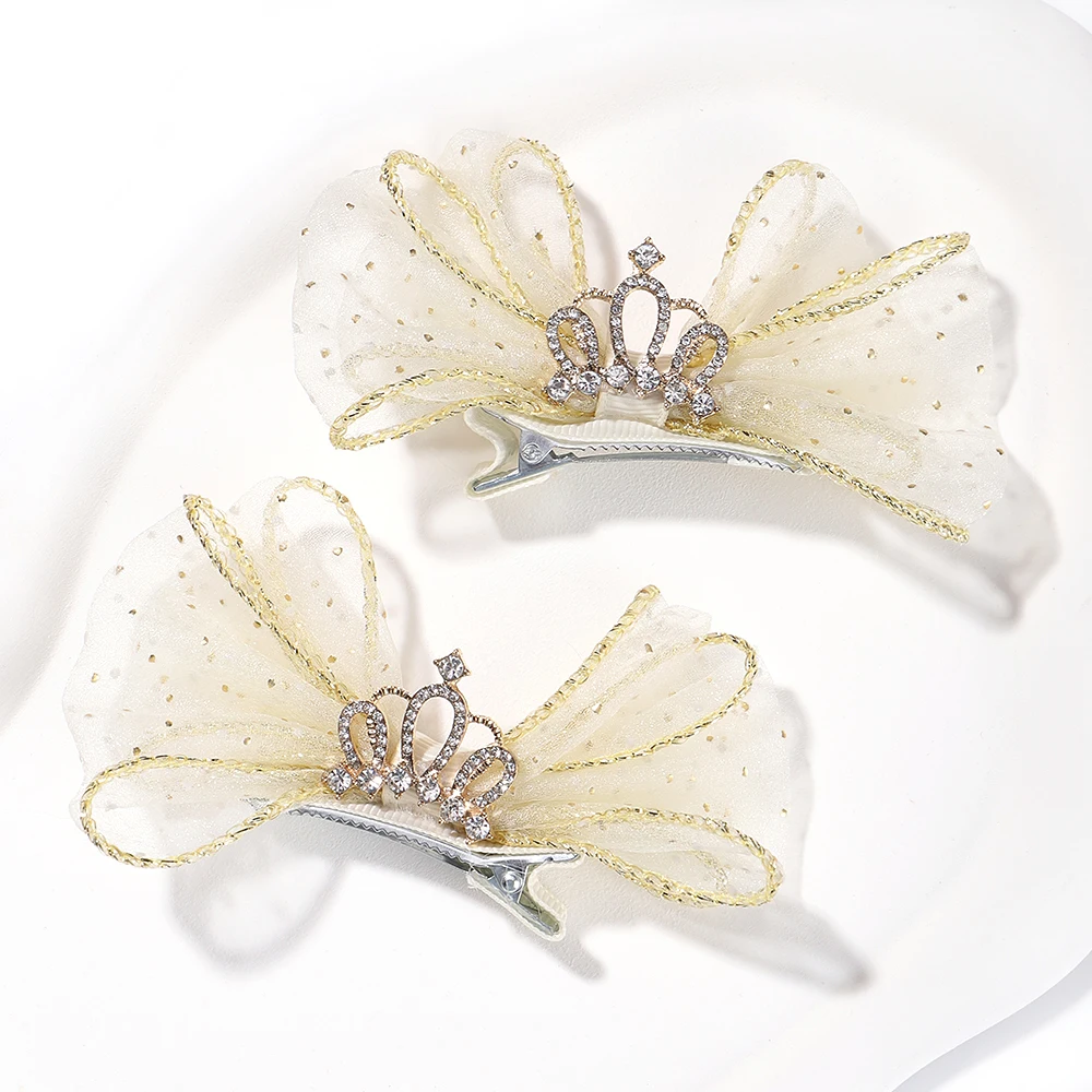 2pcs 소녀 헤어 클립 어린이를위한 사랑스러운 Organza 활 머리핀 바레트 지르콘 크라운 머리 장식 어린이 아기 헤어 액세서리