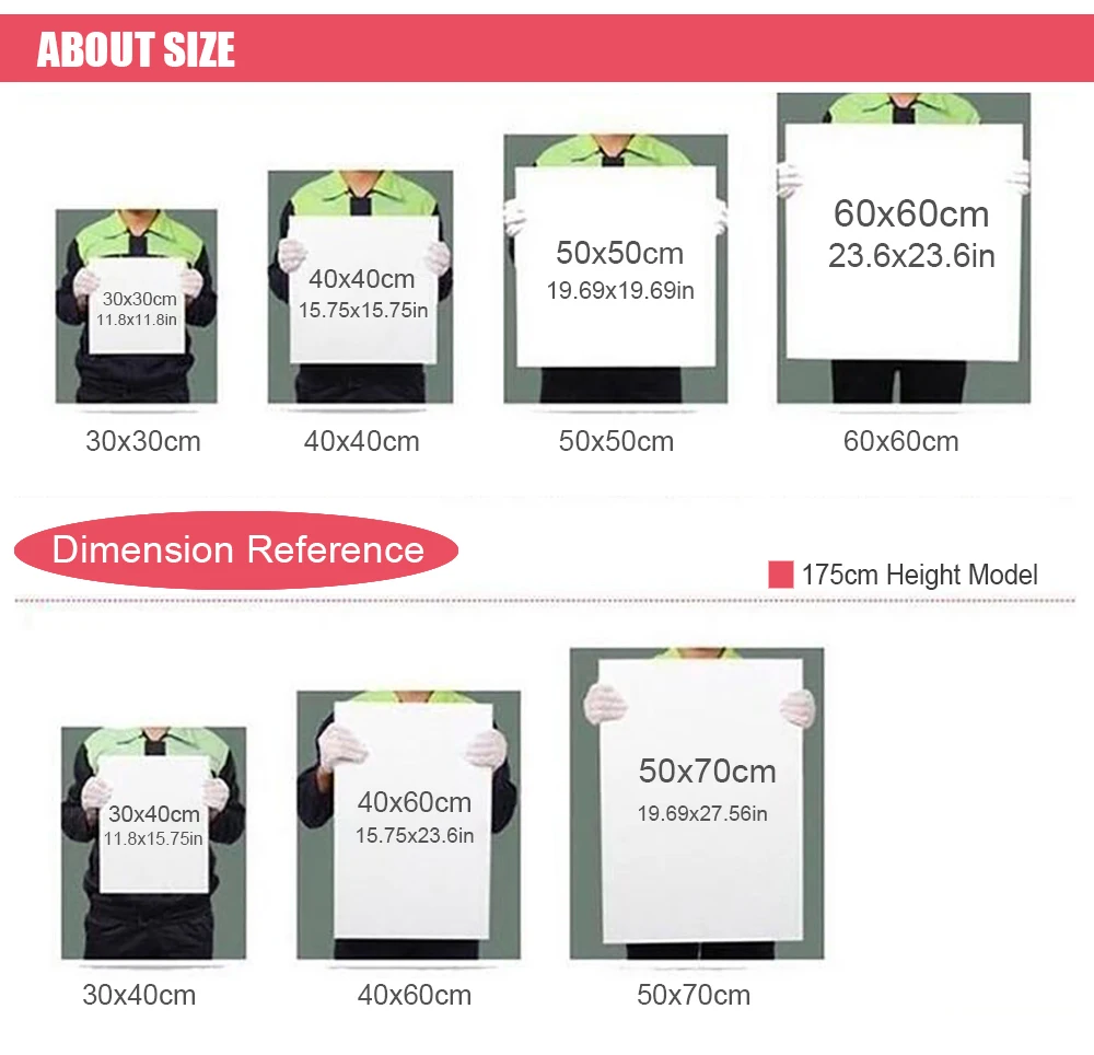 1. The cutting, design and production of photos, the size of the canvas may cause size deviation (fluctuations of 1-2cm), after receiving the diamond painting, please purchase the photo frame according to the size of the diamond painting.