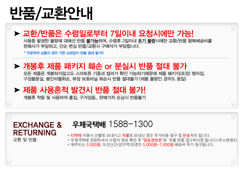 1.이유없는 반품 시 상품이 이미 발송된 경우 반송 비용(반송료 및 배송료)를 부담해야 합니다.
