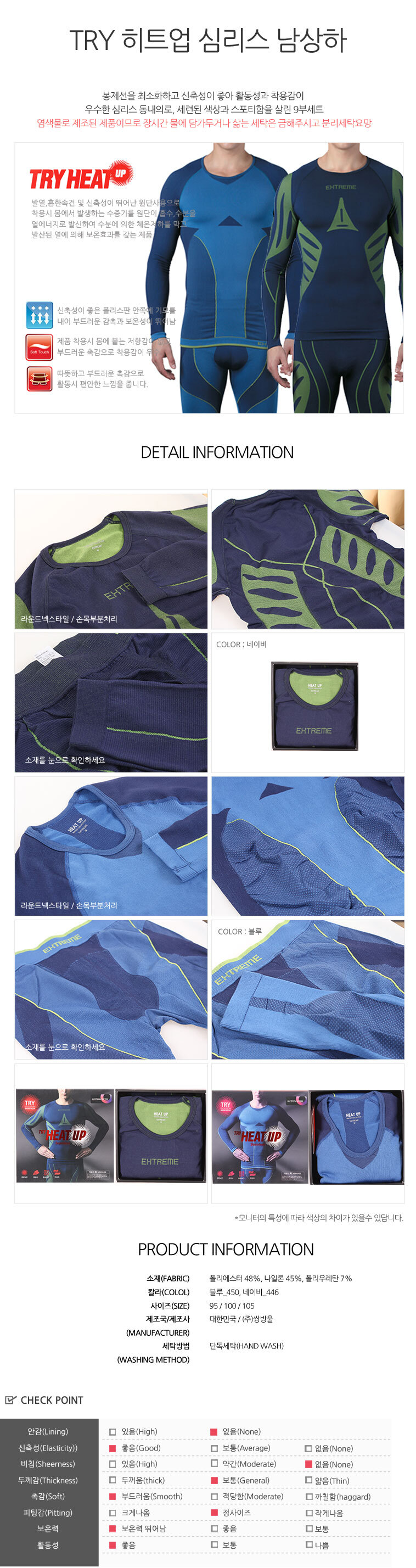 TRY 히트업 심리스 무봉제 기능성 남성 내복 동내의