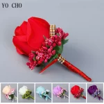 YO CHO 웨딩 부케 인공 장미 꽃 블루 브로치 코사지 반짝이 라인 석 리본 레이스 클래식 댄스 파티 Boutonniere 핀